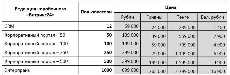 - Редакция "CRM" (12 пользователей) – 59 000 рублей. Данная редакция аналог облачного тарифа "Компания" (за исключением экстранета).