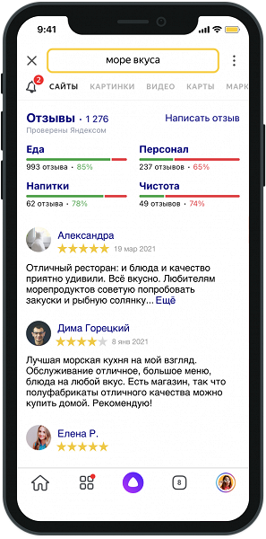 Также улучшили информацию о различных заведениях и организациях. Теперь система проводит анализ отзывов, обобщает их и показывает в результатах поиска обобщенный отзыв и шкалу с оценками.