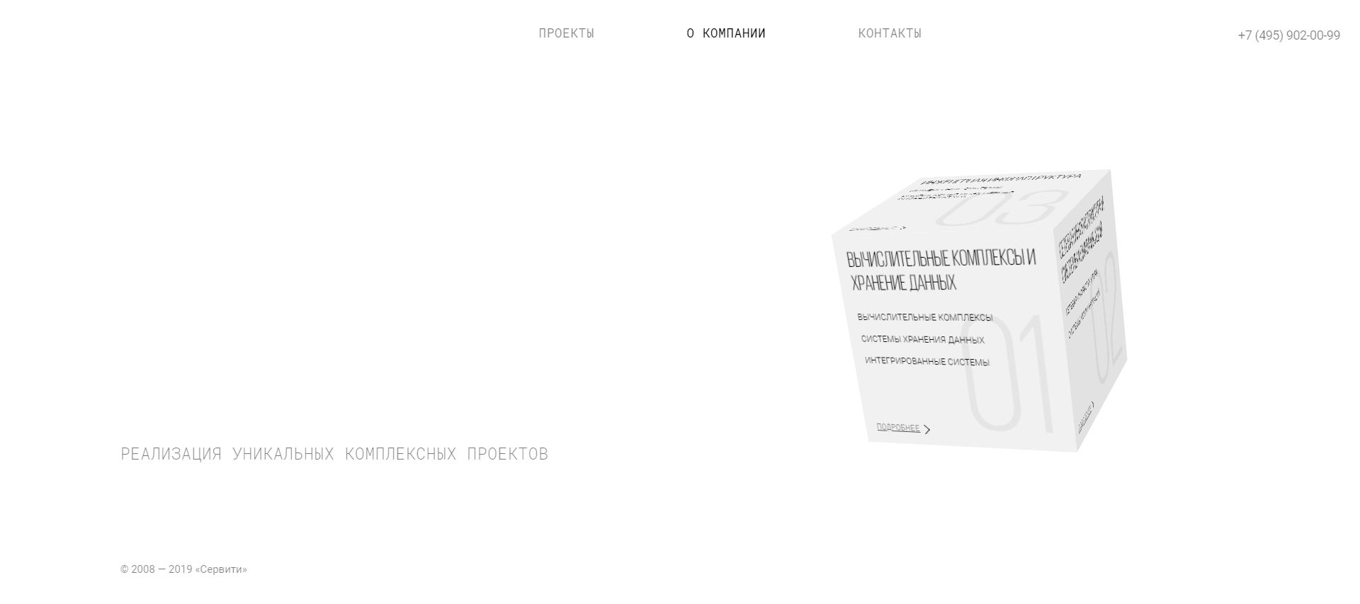 Так как клиенты Servity — довольно серьезные организации, то и сайт должен быть лаконичным и информативным.Главным визуальным решением стал куб — он интерактивный и ведет на разные страницы, которые рассказывают о трех основных направлениях компании.